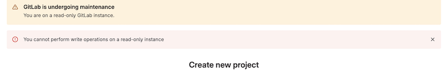 所有只读 Git 操作(例如 git clonegit pull)都继续有效。所有写入操作都会失败,无论是通过 CLI 还是 Web IDE,并显示错误消息:Git push is not allowed because this GitLab instance is currently in (read-only) maintenance mode.