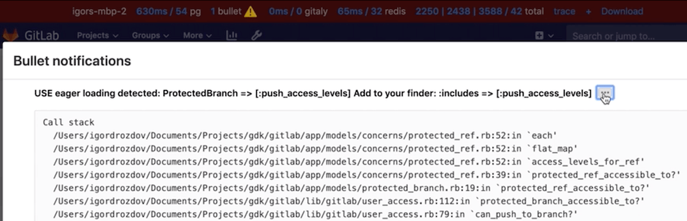 Bullet 是一个用于追踪 N+1 查询问题的 Gem。它将查询问题记录到 Rails 日志和浏览器控制台。Bullet 部分显示在 性能栏 中。