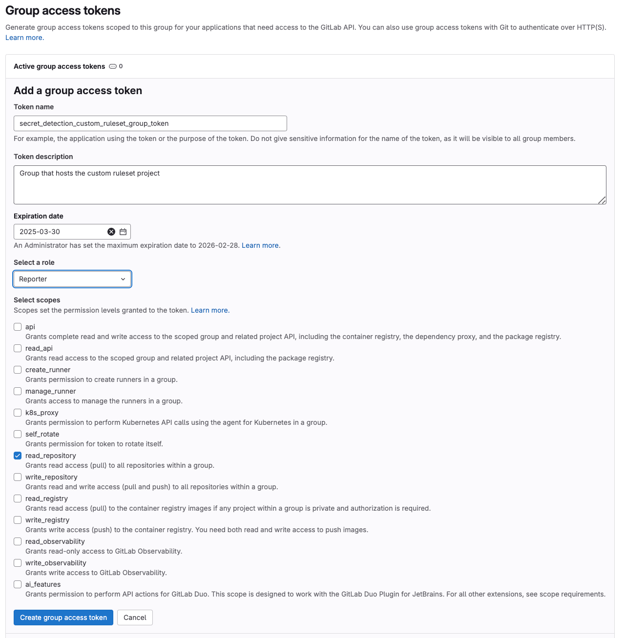 Secret Detection中,在设置菜单选项下创建群组访问令牌Secret Detection Group Token,给令牌reporter角色,并授予read_repository访问权限