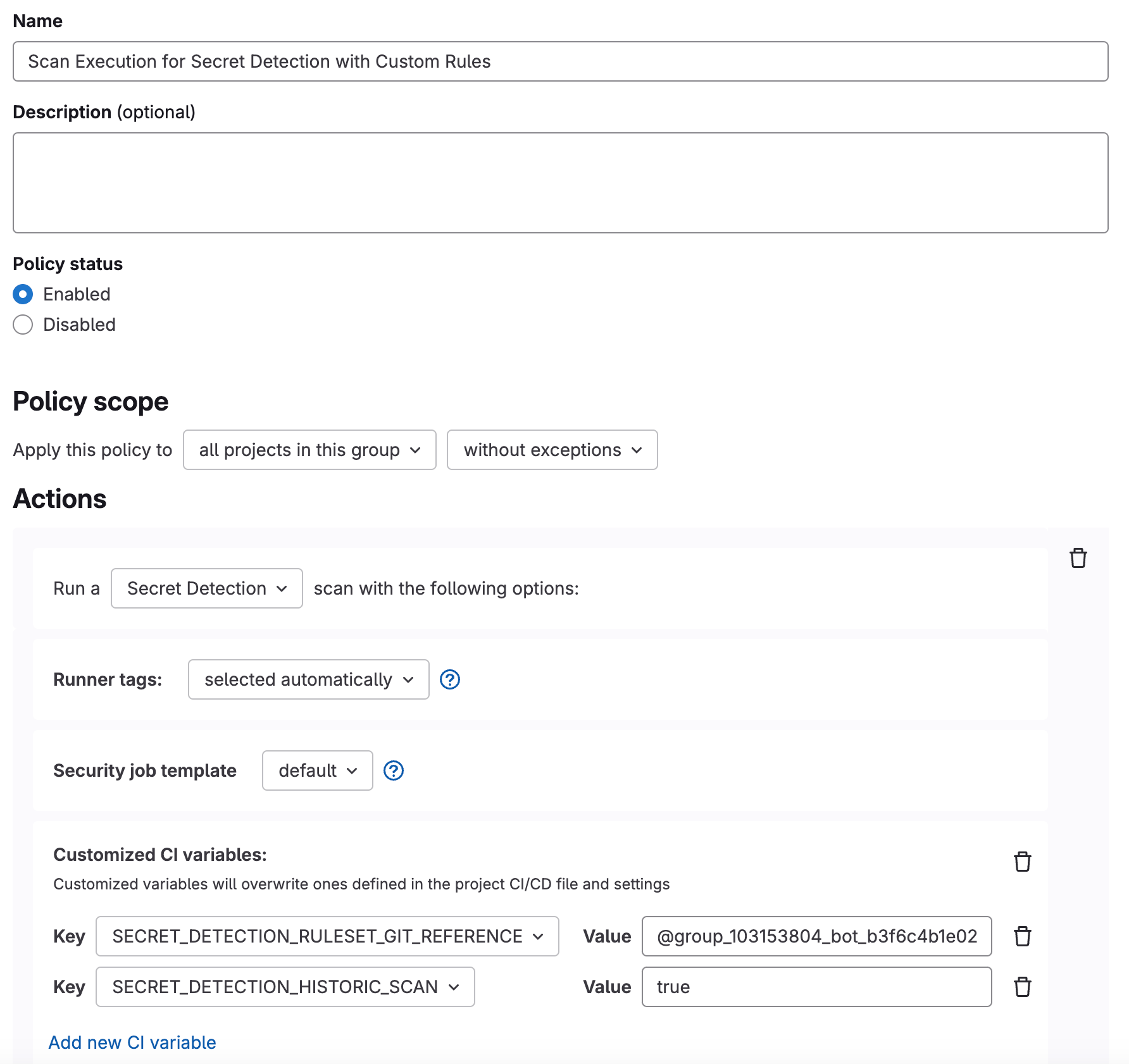 SECRET_DETECTION_HISTORIC_SCAN: "true"UI 配置如屏幕所示: