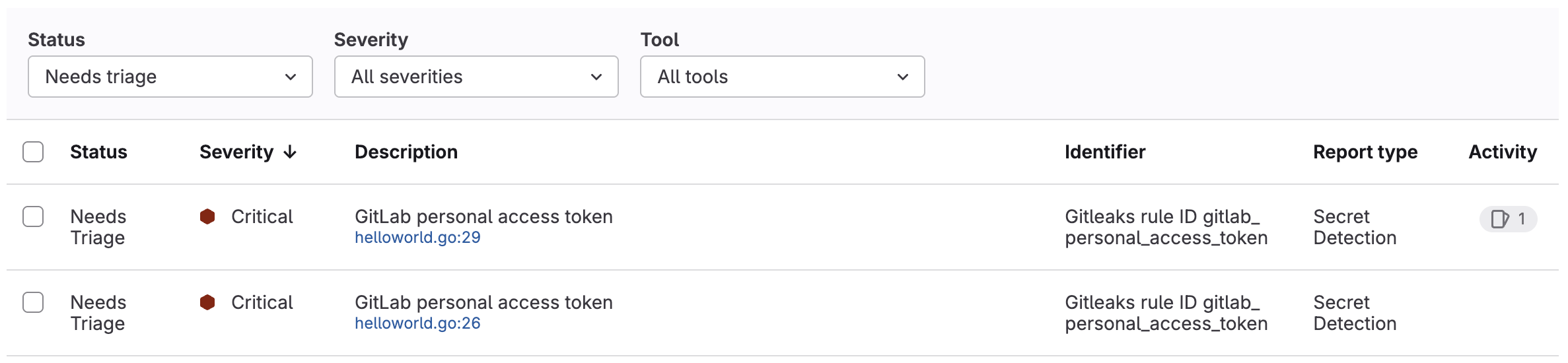 .gitlab-ci.yml文件,并在作业中将报告作为工件。例如,重现由 SAST 作业引起的错误: