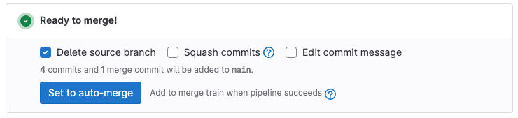 如果合并请求的内容已准备好合并,您可以选择 设置为自动合并。当所有必需的检查都成功完成后,合并请求将自动合并,您无需记住手动合并该合并请求。